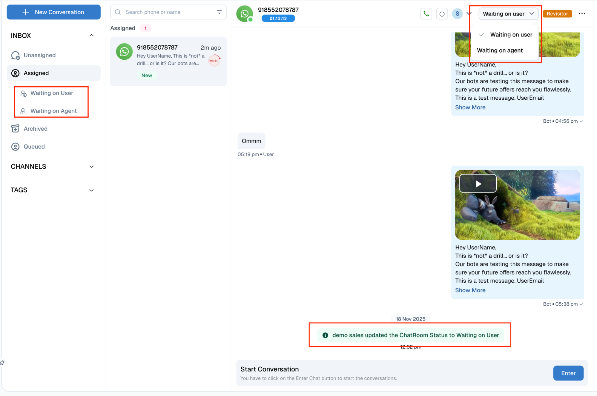 - WhatsApp Templates: For WhatsApp channels, agents can send a pre-approved template to prompt the user; once the user replies, the chat returns to live.