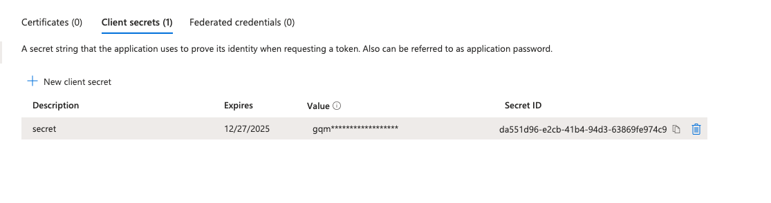 - Go to Certificates & Secrets → Create Client Secret
