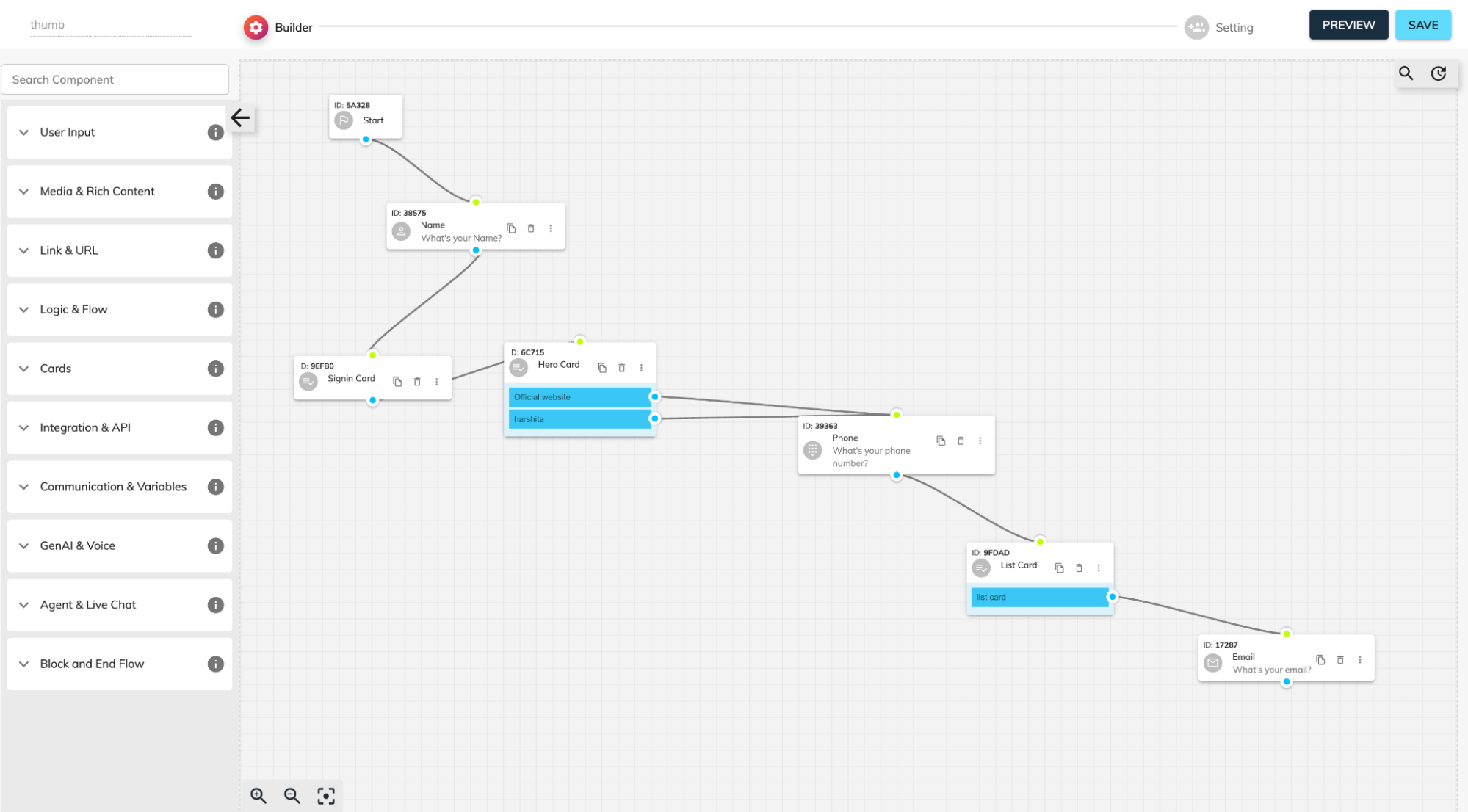 - Drag in a Start Node, then add components (Message, Name, Phone, Multiple Choice, Cards, etc.).