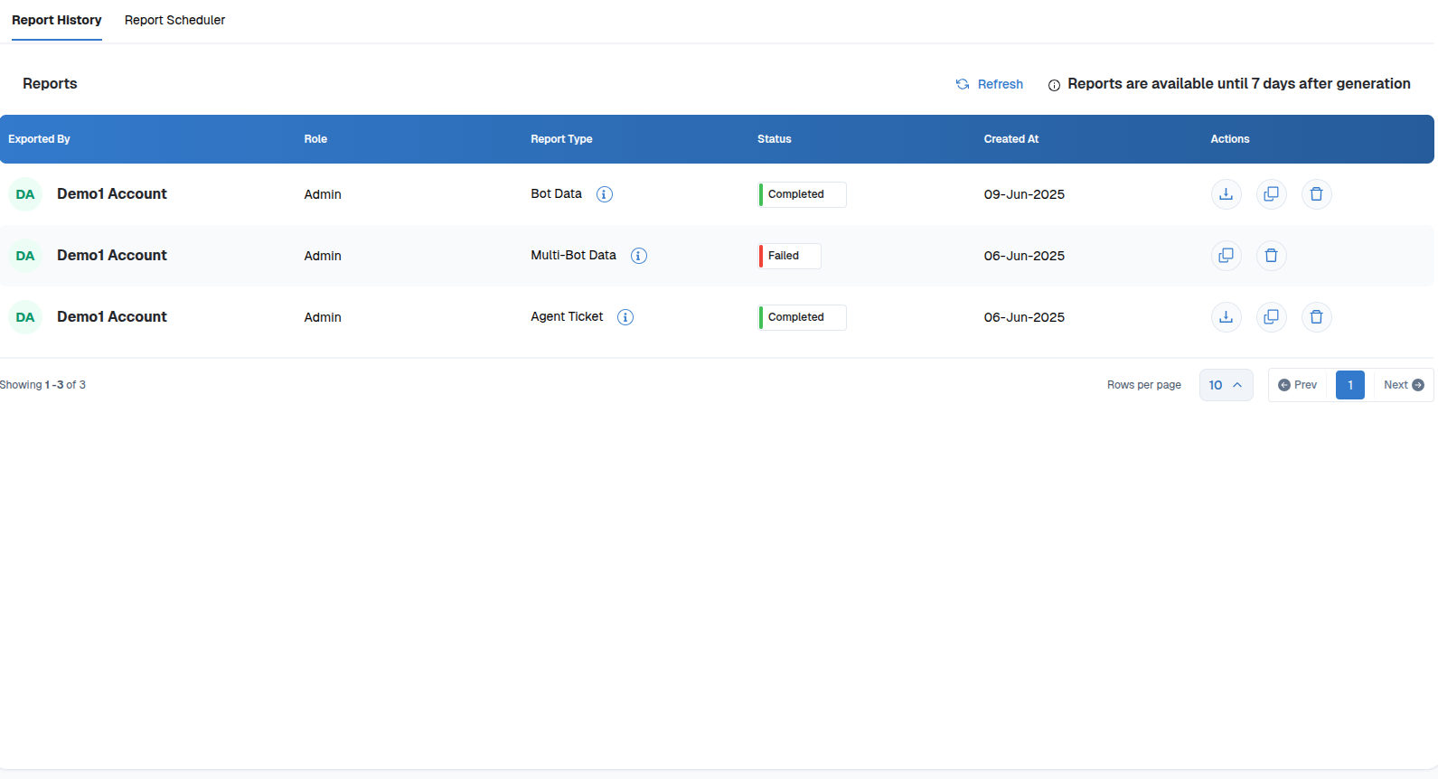 The Reports section in Chat360 maintains a complete history of every generated and downloaded analytics report. Whenever a user requests a report—whether Bot Data, Multi-Bot Data, Agent Tickets, or Template Stats—the system processes the data in the background and logs the request under Report History. Completed, failed, or in-progress statuses are clearly marked, and reports remain available for download for 7 days after generation.