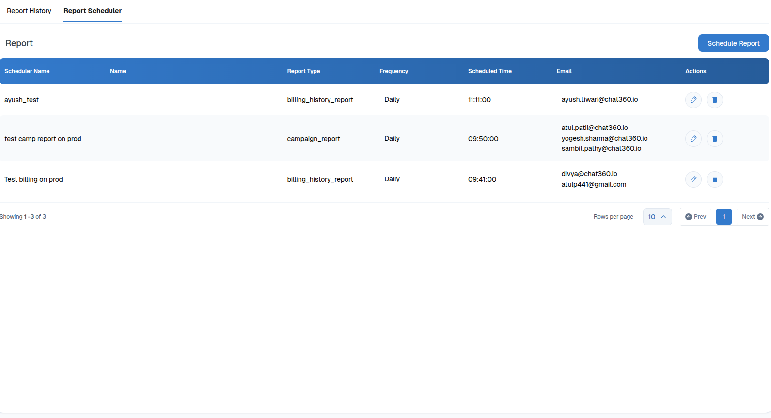 - Edit (✎): Modify frequency, time, or email recipients.
